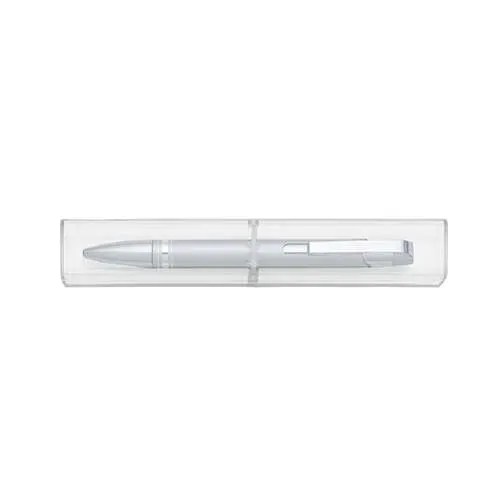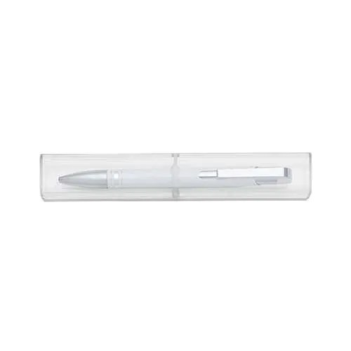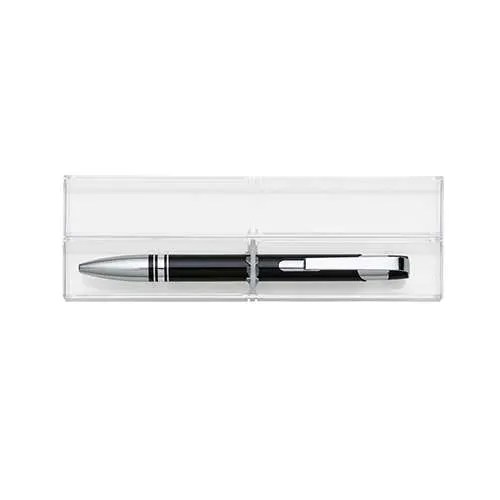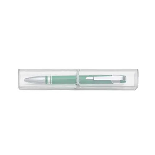 Caneta semi metal com tubo de acrílico retangular. Caneta inteira colorida com detalhes prata, clip metal, possui 3 anéis na parte inferior e aciona por clique. No tubo há uma espécie de “anel” emborrachado para sustentar/encaixar a caneta. observação: Tubo 15,7 cm x 2,5 cm – Caneta 13,7 cm x 1,4 cm