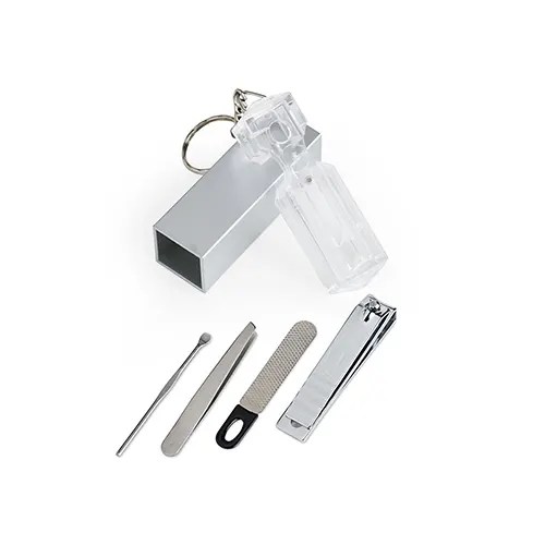 Descrição: Chaveiro kit manicure 4 peças em estojo plástico. Possui lixa, pinça, empurrador de cutícula e cortador de unha preso. Estojo com berço plástico para acomodação das peças.
