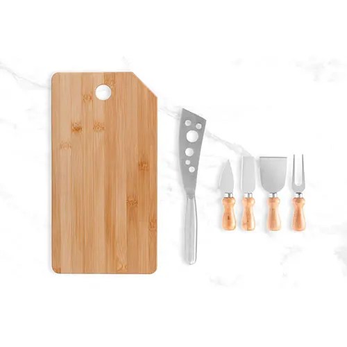 Descrição: Conjunto para queijo em Bambu/Aço Inox. Conta com tábua em Bambu; duas facas, sendo, uma com ponta e outra reta, garfo e espátula em Metal/Bambu; faca para frios em Metal. Acompanha embalagem Kraft