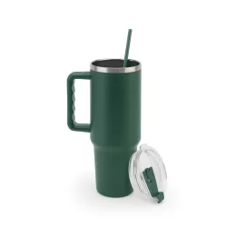 Copo de viagem de grande dimensão para se manter hidratado durante o dia sem a necessidade de recargas constantes. Composto em aço inox 91% reciclado, com parede dupla isolada a vácuo e acabamento em mate. Este copo pode ser utilizado de duas maneiras: através da sua abertura para canudo ou do orifício para utilização direta (pode ser fechado). A sua pega facilita o transporte quer seja para o trabalho ou para atividades ao ar livre. Capacidade até 1300 mL. Fornecido em caixa presente de papel kraft reciclado. Certificação EU Food Grade. ø143 x 257 mm (sem canudo) | Canudo: 305 mm