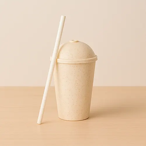 Descrição: Copo produzido em fibra de madeira com tampa e capacidade de até 450ml. Acompanha canudo plástico para encaixe na tampa.