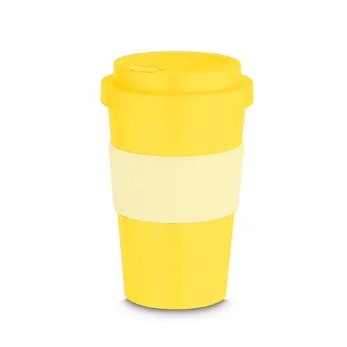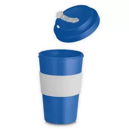 Copo plástico produzido em Plástico RPET, com capacidade de 400ml, tampa rosqueável e detalhe em silicone.