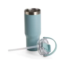 Descrição: Copo térmico em aço inox com capacidade de até 900ml. Apresenta construção em parede dupla, tampa rosqueável plástica com vedação a vácuo e tampa adicional com proteção para o bocal, o que permite a conservação da temperatura de líquidos por mais tempo. Conta ainda com bico flip, canudo plástico interno removível e alça para transporte. Sua pintura eletrostática confere uma cor duradoura e um acabamento de alta qualidade.