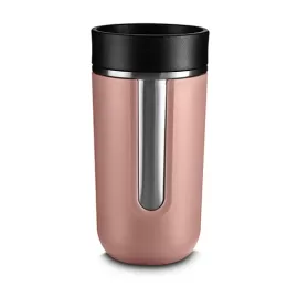 Copo térmico com parede dupla em aço inox e detalhe em plástico,capacidade de 350ml, tampa plástica com sistema antivazamento e botão para habilitar o fluxo de líquido.