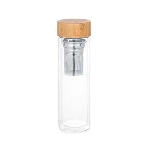 Garrafa em vidro de borossilicato com parede dupla e tampa em bambu. Incluso 2 infusores em aço inox. A garrafa tem uma capacidade até 490 ml. Apta para ir a máquina de lavar, removendo a tampa. Fornecida em caixa em papel kraft. ø72 x 234 mm