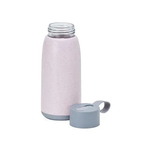 Descrição: Garrafa de vidro 350ml com revestimento plástico, tampa plástica com alça de silicone.