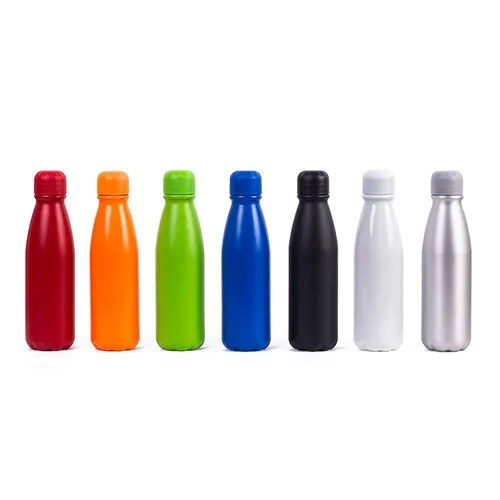 Garrafa em alumínio, tampa em aço inox colorido. Capacidade: 500ml, pintura fosca.
