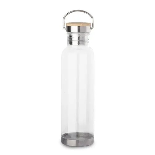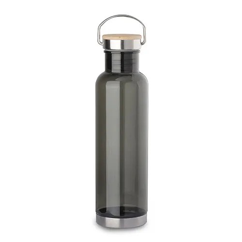 Garrafa plástica com tampa de aço inoxidável com detalhe na tampa em bambu. Tampa rosqueável. Com capacidade de até 750ml.