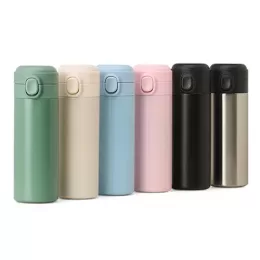 Descrição: Garrafa térmica em inox com parede dupla, capacidade de 400ml. Tampa com botão central para abertura e borracha interna para vedação.