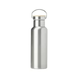 Descrição: Garrafa térmica feita em inox com parede dupla, capacidade de 500ml. Tampa com acabamento em bambu e alça para transporte.