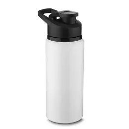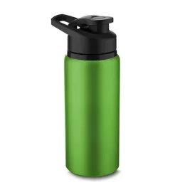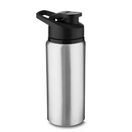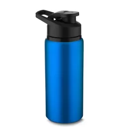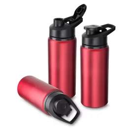 Garrafa de alumínio com capacidade de até 650ml em cores. Tampa rosqueável, bico com tampa vedada de acesso rápido, e alça para transporte.