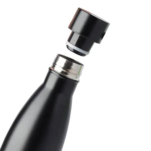 Garrafa térmica em aço inox com parede dupla isoladao à vácuo, com tampa de inox na cor do produto e anel de silicone para vedação. Capacidadede até 500ml, pintura fosca.