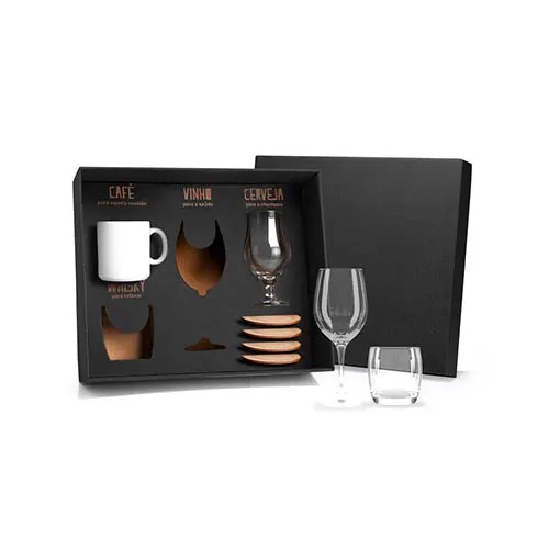 Descrição: Conta com 1 copo de cada para Vinho/Cerveja/Whisky de Vidro; caneca em Cerâmica; 4 porta copo em MDF.