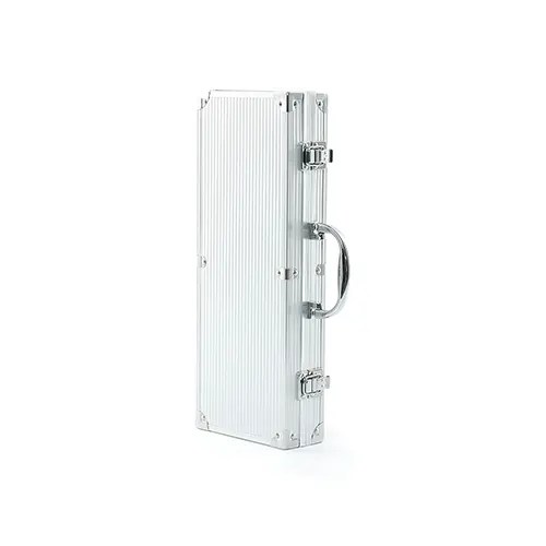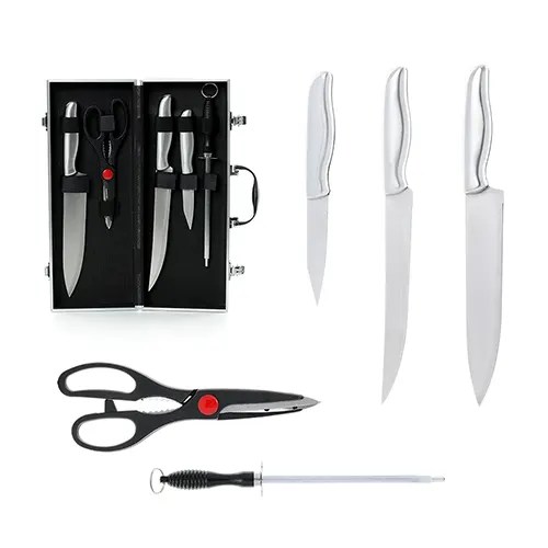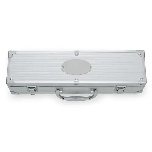 Descrição: Kit churrasco 5 peças em maleta de alumínio com travas de segurança, contém três facas de corte, tesoura e chaira. Parte interna da maleta com revestimento em tnt e suportes de velcro para fixação das peças.