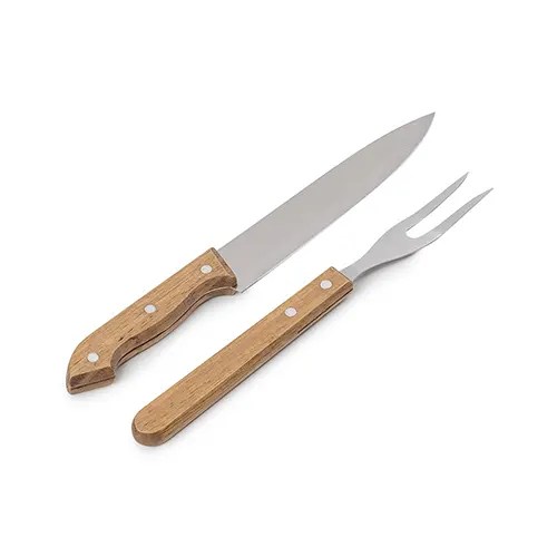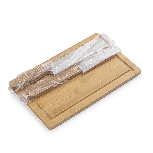 Kit Churrasco com 3 peças: Garfo, Faca com 31,7 cm, ambos com cabos de madeira e lâminas em aço inox, Tábua de bambu com 1,2 cm de espessura.