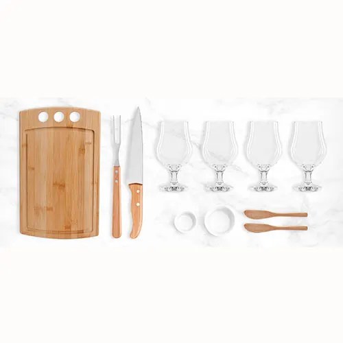 Descrição: Kit para Churrasco, Petisco e Cerveja com tábua três furos e duas espátulas em Bambu; faca 7” e garfo em Bambu/Inox; dois ramequins em Porcelana; quatro taças de cerveja em Vidro.