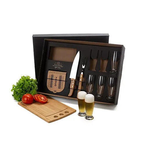 Descrição: Kit para Churrasco e Cerveja. Acompanha tábua com três furos em Bambu; faca 8” e garfo em Bambu/Inox; seis copos de cerveja em Vidro; caixa para truco com marcador de tentos e jogos em MDF; jogo de cartas.
