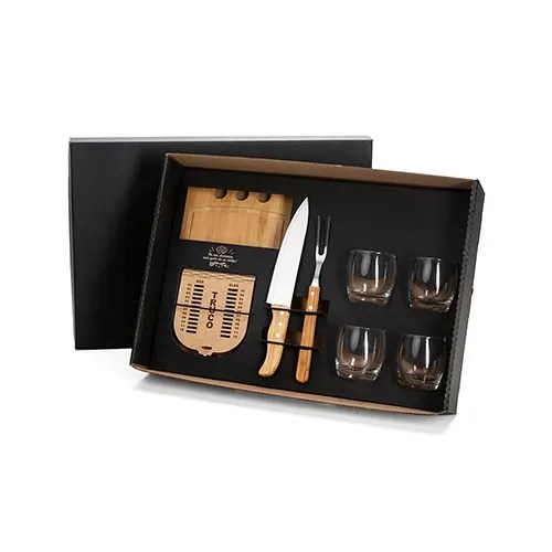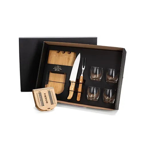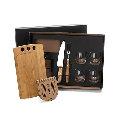 Descrição: Conjunto para Churrasco / Whisky / Truco. Acompanha tábua com três furos em Bambu; faca 8” e garfo em Bambu/Inox; quatro copos de whisky em Vidro; caixa para truco com marcador de tentos e jogos em MDF; jogo de cartas.