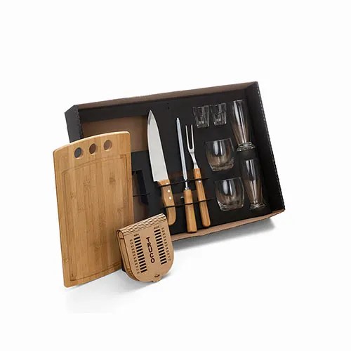 Descrição: Kit contendo tábua com três furos em Bambu; faca 8” e garfo em Bambu/Inox; dois copos de cerveja, dois copos de whisky e dois copinhos de dose em Vidro; caixa para truco com marcador de tentos e jogos em MDF; jogo de cartas.