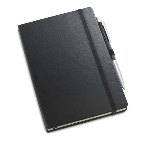Kit de Caderno e Esferográfica. Cartão e Alumínio. Caderno capa dura com 96 folhas não pautadas cor marfim. Em caixa almofadada. Incluso caderno e esferográfica. Caderno: 137 x 210 mm | Esferográfica: ø11 x 136 mm | Caixa: 190 x 240 x 30 mm