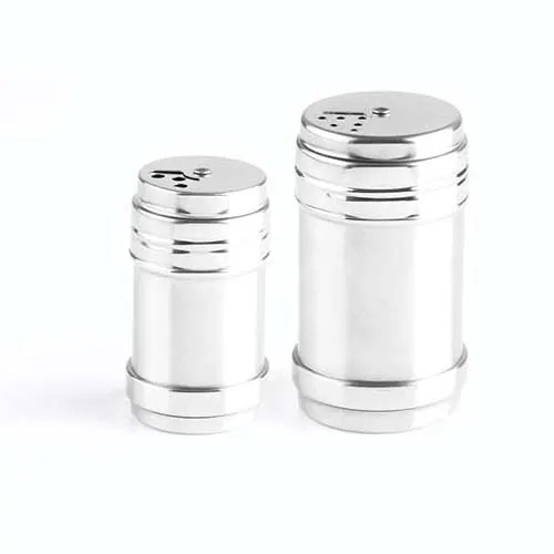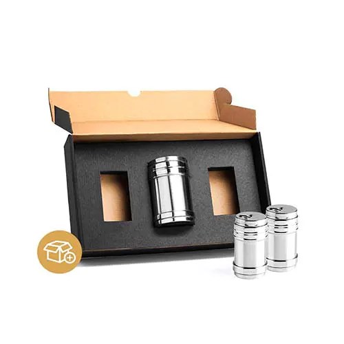 Kit contendo três potes de aço inox para temperos com tampa giratória.