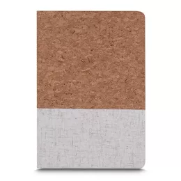 O caderno de anotações é feito de cortiça com detalhe em algodão cru, em capa dura com miolo 80 folhas pautadas.