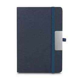 O caderno de anotações é feito de PET Reciclado, acompanha placa em metal, em capa dura com miolo 80 folhas pautadas na cor bege.