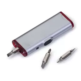 Kit Ferramenta 3 peças com lanterna. Material plástico de corpo prata e detalhes coloridos com duas lanternas (possui botão liga/desliga) e suporte para ferramenta, acompanha 3 chaves de duas pontas, um lado Philips e outro lado fenda. Utiliza duas baterias Lithium CR1220.