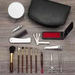 Descrição: Kit manicure 15 peças em estojo de couro sintético com zíper, parte interna revestida com plástico em relevo e elástico para fixação dos itens. Possui: pente, removedor de pelos, espelho duplo, empurrador de cutícula, pinça, cortador de unha, tesoura, mini kit unha 3 em 1(empurrador de cutícula, lixa, limpador de unha), cortador de cutícula e 6 pincéis: blush, sombra, esfumador, côncavo, batom e pente para sobrancelhas.