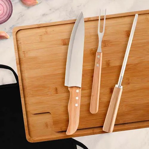 Kit para Churrasco e Petisco Conta com tábua para churrasco em Bambu; faca 8″, chaira e garfo em Bambu/Inox; duas cumbucas em Bambu; avental preto em Brim. Estão perfeitamente acomodados em uma caixa para presentear.