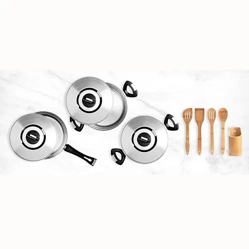 Descrição: Kit para cozinha Conta com 2 caçarolas com tampa, frigideira com tampa e chaleira em Inox; colher 30cm, colher perfurada 30cm, espátula 30cm, espátula perfurada 30cm e suporte para utensílios em Bambu.