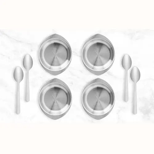 Descrição: Kit para sobremesa contendo 4 potes e 4 colheres em aço inox e embalagem.
