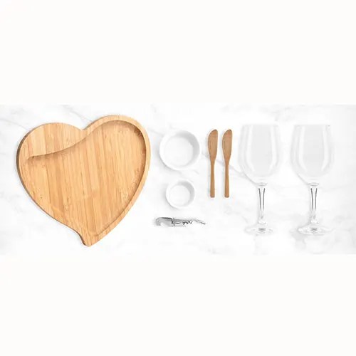 Descrição: Kit para Petisco e Vinho Conta com petisqueira formato de coração e duas espátulas em Bambu; dois ramekins em Porcelana; duas taças para vinho em Vidro; abridor em Metal. Estão perfeitamente acomodados em uma caixa para presentear.