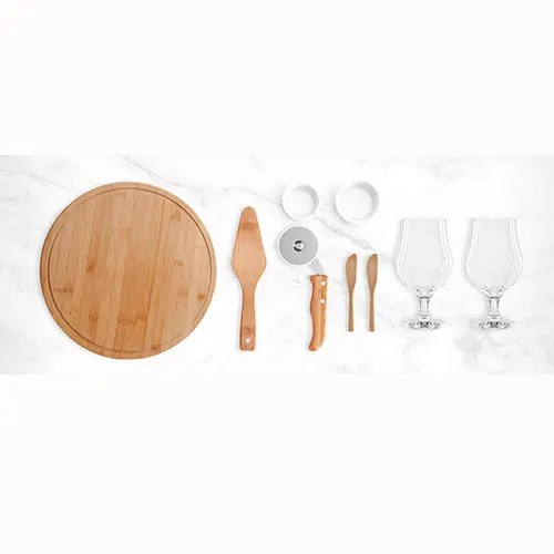 Descrição: Kit para Pizza e Cerveja Conta com tábua para petisco/pizza, espátula para pizza e duas espátulas 14cm em Bambu; cortador de pizza em Bambu/Inox; duas taças para cerveja em Vidro; dois ramekins em Porcelana. Estão perfeitamente acomodados em uma caixa para presentear.