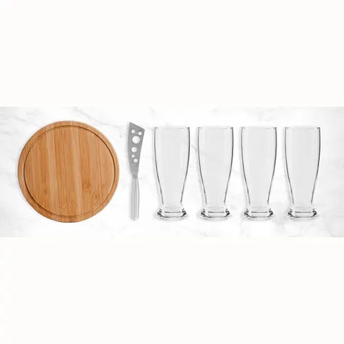 Descrição: Kit para Queijo e Cerveja Conta com tábua redonda para queijo/petisco; faca para frios em Metal; quatro copos para cerveja em Vidro. Estão perfeitamente acomodados em uma caixa para presentear.
