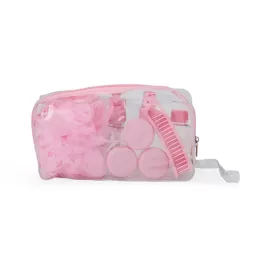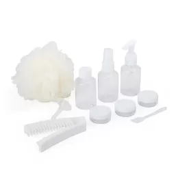 Descrição: Este kit viagem oferece organização e praticidade em 10 peças essenciais para armazenar e aplicar produtos de higiene e beleza. Com frascos produzidos em PET, o kit contém 1 frasco spray de 60ml, 1 frasco com tampa rosqueável de 60ml, 1 frasco pump de 60ml com trava, 3 potinhos de 8ml, espátula, funil, escova de cabelo e pente 2 em 1 e uma esponja de nylon com alça, ideal para uso com sabonete líquido, deixando a pele mais suave e macia. Todas as peças vêm acomodadas em um estojo de PVC com alça, garantindo fácil transporte e um cuidado ideal para viagens ou eventos longe de casa.