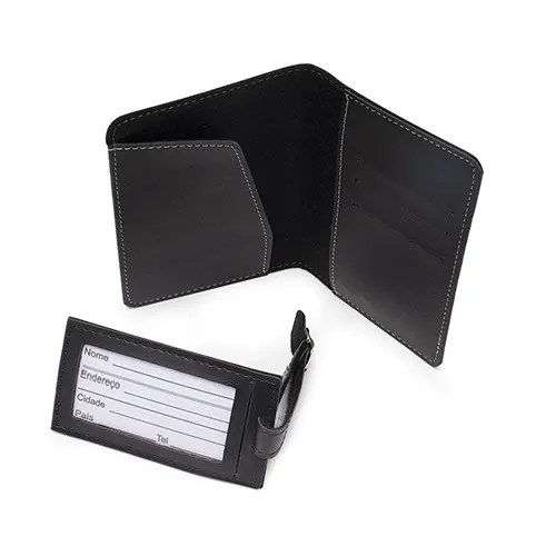 Descrição: Kit Viagem 2 peças Bidins em couro sintético. Possui porta passaporte Porta com três divisórias para cartões e identificador de bagagem com fivela ajustável.