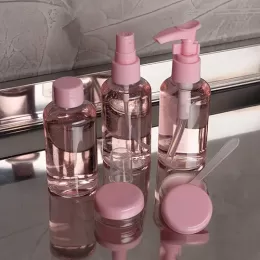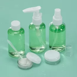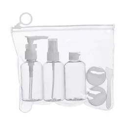 Descrição: Kit viagem 6 peças em estojo ziplock. Contém frasco de 80ml com tampa spray; frasco de 80ml com tampa rosqueável; frasco de 80 ml com tampa pump; 2 potes de 10ml com tampa rosqueável e mini espátula fosca. Frascos plásticos e estojo em pvc com puxador plástico.
