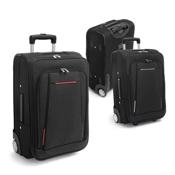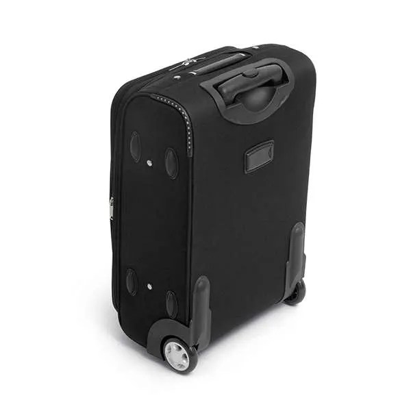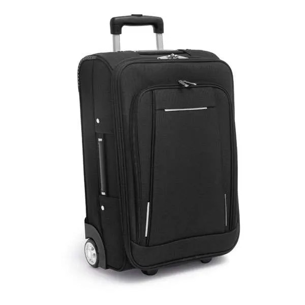 Mala de Viagem. 600D e EVA. Com 2 rodas. Compartimento frontal semi-rígido. Interior forrado. Pega extensível em alumínio, com mola (altura da pega estendida: 505 mm). 340 x 530 x 210 mm
