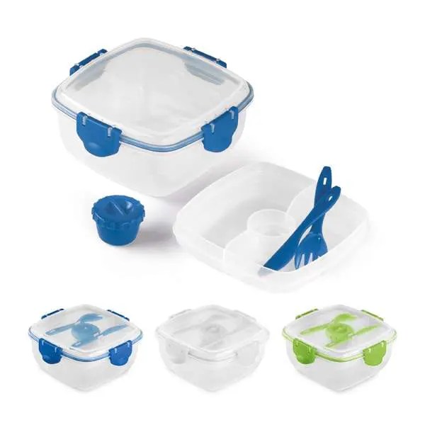 Em PP. Com 3 compartimentos, garfo, faca e molheira. Capacidade total: 1.200 ml. Apta para microondas (retirar a tampa). Food grade. 175 x 175 x 87 mm