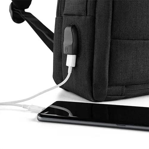 Mochila e Pasta para notebook, pode ser usada como uma pasta, utilizando a alça lateral para ser carregada, ou como mochila normal. Possui cabo USB interno com conector externo na lateral. Divisão interna para notebook, com elástico protetor, um compartimento interno com divisória, dois bolsos externos com ziper. Alça do ziper com furo para cadeado. Forrada. Material: Poliéster.