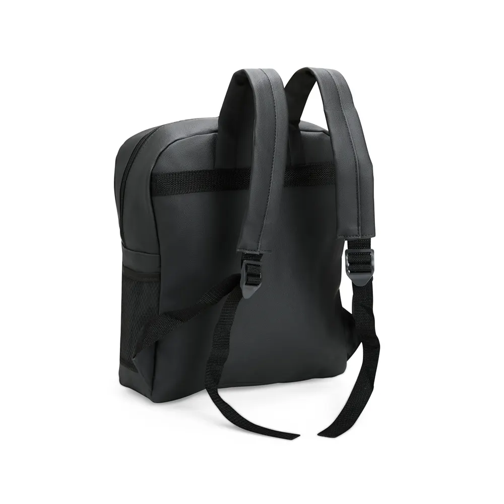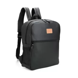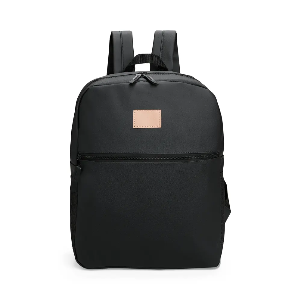 Descrição: Mochila feita em couro sintético impermeável, com fechamento em zíper e capacidade máxima de 20 litros. Apresenta divisória interna, ideal para notebooks de até 14 polegadas. Conta também com um bolso frontal com uma plaquinha costurada e dois bolsos laterais em tela feitos em nylon.