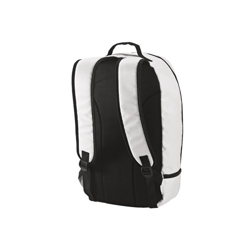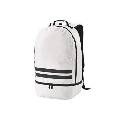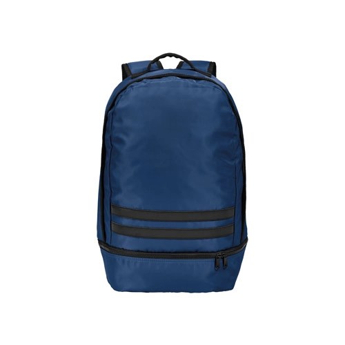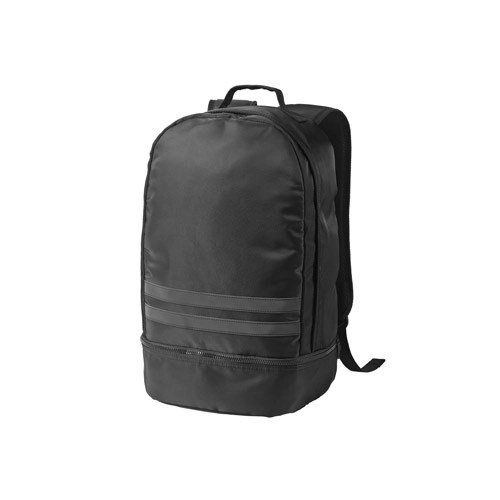 Mochila em 290T poliéster reciclado (100% rPET), em sarja com forro em 210D poliéster reciclado (100% rPET). Contém 1 compartimento principal e 1 compartimento inferior ideal para guardar sapatos. Mochila totalmente forrada com costas e alças almofadadas. Contém duas faixas pretas refletoras na parte da frente. Capacidade até 25 L. 300 x 480 x 210 mm