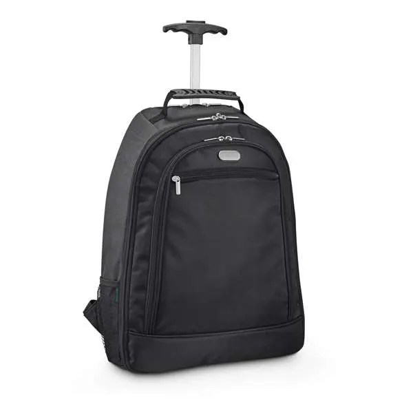 Mochila trolley para notebook 1680D e 600D, 2 rodas e compartimento principal almofadado para notebook 15.6”. Segundo compartimento forrado e com diversos bolsos.