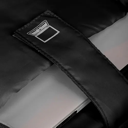 Mochila para notebook em tecido poliéster 600D e detalhe em PU, compartimento interno para notebook de até 15,6″, engate para mala de viagem, dois bolsos laterais e bolso frontal com zíper.
