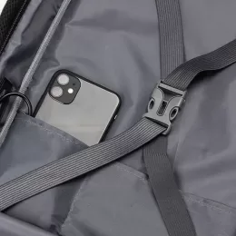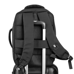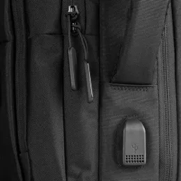 Mochila produzida em tecido de poliéster 600D, alça de ombro e mão acolchoada,2 bolsos frontais e divisórias internas, aceita notebooks de até 15,6″, porta USB na lateral da mochila, possui engate para mala de viagem.