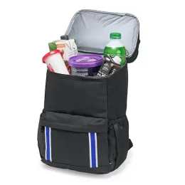 Descrição: Alimentos e bebidas frescos e conservados por mais tempo com a nossa mochila térmica. Possui capacidade total para até 18 litros, tornando-a uma opção versátil para todas as ocasiões, desde eventos ao ar livre até atividades mais cotidianas. Feita em poliéster impermeável com revestimento interno em PEVA atóxico, que possui propriedades contra vazamentos, ela garante proteção completa para um aproveitamento pleno de suas capacidades sem quaisquer tipo de preocupações. A mochila térmica ainda traz um bolso superior na parte externa que também apresenta revestimento em PEVA atóxico, com capacidade de aproximadamente 1,5 litros, ideal para carregar objetos menores como potes plástico com frios, por exemplo. Além disso, ela conta também com um bolso frontal que pode ser usado para carregar itens como talheres e guardanapos além de outros dois bolsos laterais em tela.