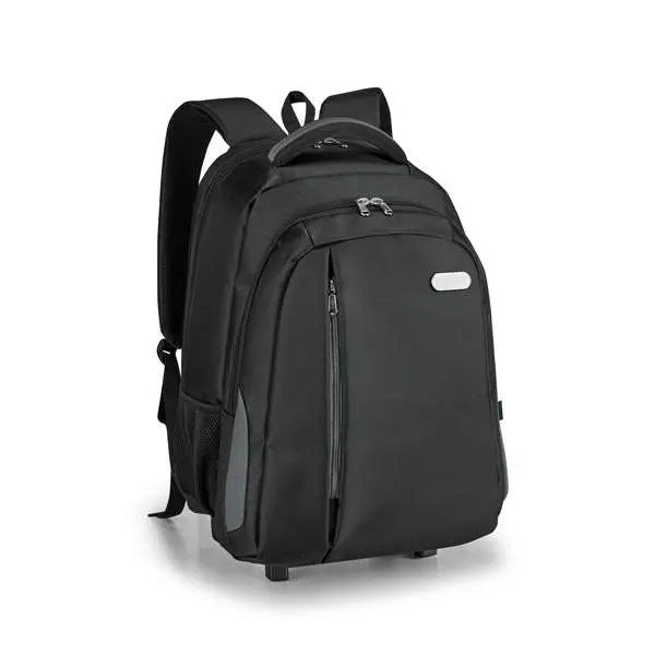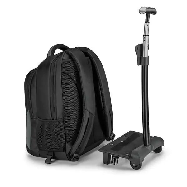 Mochila Trolley para Notebook. Nylon 999. Material à prova de água. Compartimento principal almofadado para notebook até 17”. Segundo compartimento forrado e com diversos bolsos. Bolso frontal com zipper e bolsos laterais com tela. Com estrutura removível e 2 rodas. Pega extensível em alumínio, com mola (altura da pega estendida: 550 mm). Chapa metálica removível com ímã para fácil gravação. 350 x 460 x 210 mm | Chapa: 50 x 20 mm