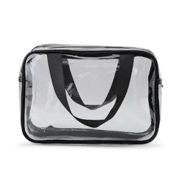 Descrição: Nécessaire de PVC. Possui dois compartimentos e duas alças laterais de mão em nylon.