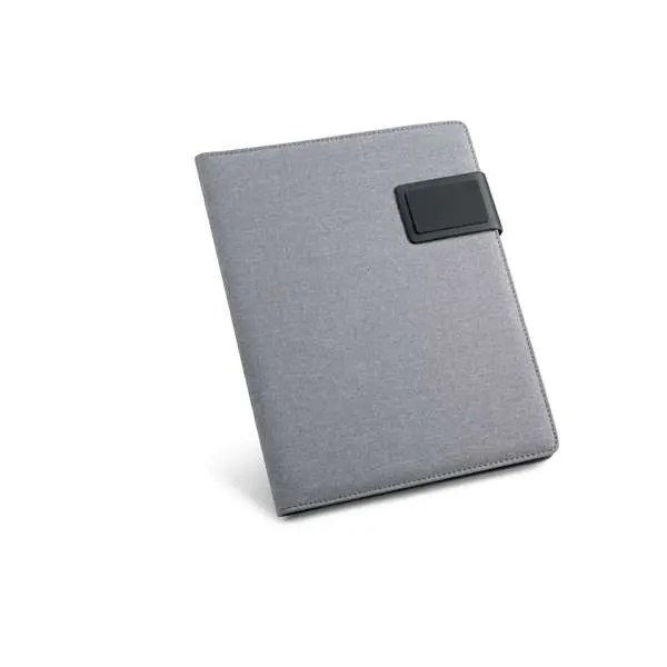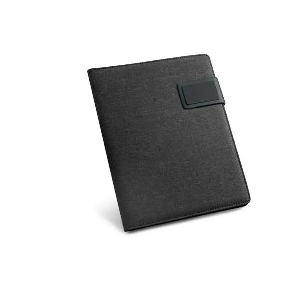 Pasta A5 em Linho Sintético e Couro Sintético. Fecho magnético. Bloco: 20 folhas pautadas. Chapa metálica com acabamento emborrachado. Esferográfica não inclusa. 183 x 252 x 18 mm | Chapa: 50 x 30 mm